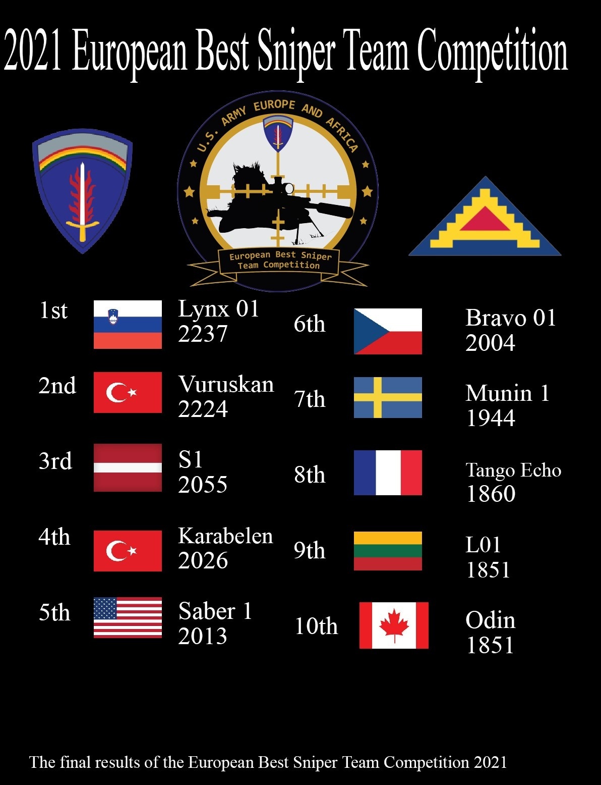 The 2021 European Best Sniper Team Competition is a U.S. Army Europe and Africa-directed, 7th Army Training Command hosted contest of skill that includes 14 participating NATO allies and partner nations at 7th ATC’s Hohenfels Training Area